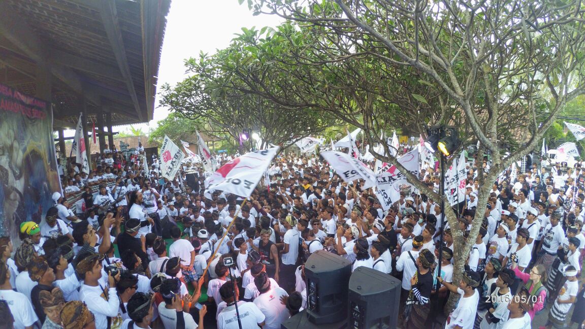 Gaungan suara rakyat Bali untuk menolak rencana reklamasi di Teluk Benoa semakin tak berbendung. Minggu kemarin (1/4), bertepatan dengan hari buruh sedunia, ribuan masyarakat Desa Adat Sukawati turun ke jalan untuk melakukan aksi deklarasi untuk menolak reklamasi Teluk Benoa.