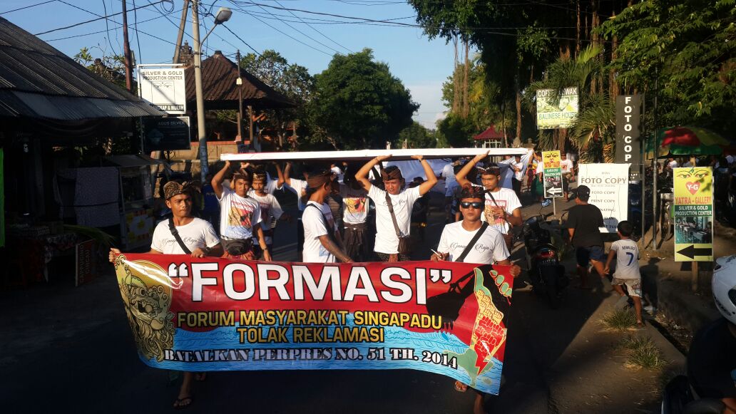 Bendera berukuran raksasa dari sumbangan pribadi masyarakat ini pun dikibarkan dengan teriakan tolak reklamasi Teluk Benoa oleh Forum Masyarakat Singapadu Tolak Reklamasi Teluk Benoa yang terdiri dari 16 Banjar yang ada di Singapadu, Gianyar ini.
